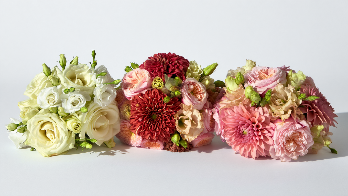 Een rond bloemstuk in zachte, poederroze tinten met dahlia’s of chrysanten, Engelse tuinrozen en lisianthus.