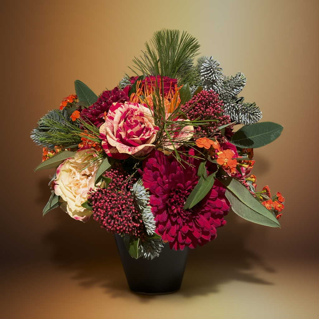 Geniet van een goed gevuld bloemstuk in een pot dat speciaal is samengesteld voor de kerstsfeer. Dit warmgetinte kerstarrangement combineert feestelijke kleuren en winterse bloemen tot een sfeervol geheel dat perfect past bij uw kerstinterieur. Ideaal als cadeau of als blikvanger op uw tafel tijdens de feestdagen.